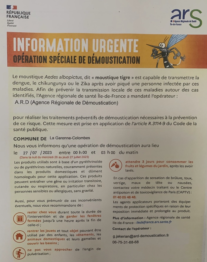 L’Agence Régionale de Santé (ARS) nous informe qu’une opération de démoustication est en cours sur toute La Garenne Colombes, et en particulier en notre résidence dans la nuit du 27 Juillet, comme expliqué en détail sur la note collée (uniquement helas…) sur la porte d’entrée côté 62-64 et dont voici une photographie :